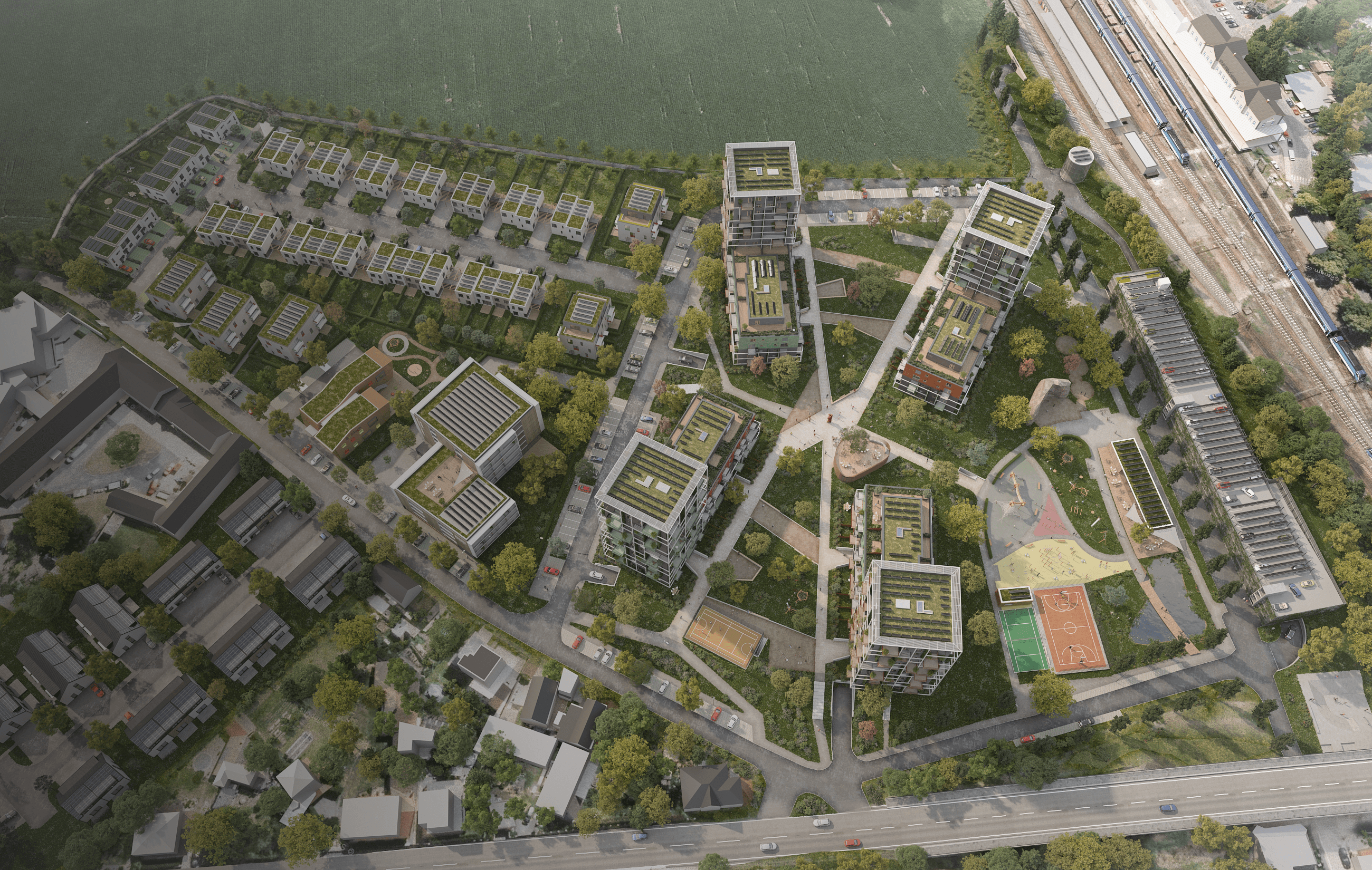 Před vlastní hmoty předsazujeme strukturální konstrukci nejen pro vynesení lodžií a balkonů, ale také pro umístění bohaté fasádní zeleně. Domy mají zelené střechy, aplikovaná řešení využití netradičních zdrojů energie a jsou navrženy ve standardu nízkoenergetických staveb. V těžišti čtveřice domů je navržen komunitní prostor ve formě kavárny, výstavního prostoru nebo jen jako prostor pro setkávání. Rekreační pojetí parteru doplňují různá hřiště. Mezi domy jsou uvažovány plochy okrasných trávníků se skupinami stromů a nižší zeleně. Po obvodě souboru jsou naopak uvažovány přírodní louky a poldry pro zachycení dešťových vod. Počítá se se zasazením desítek stromů.