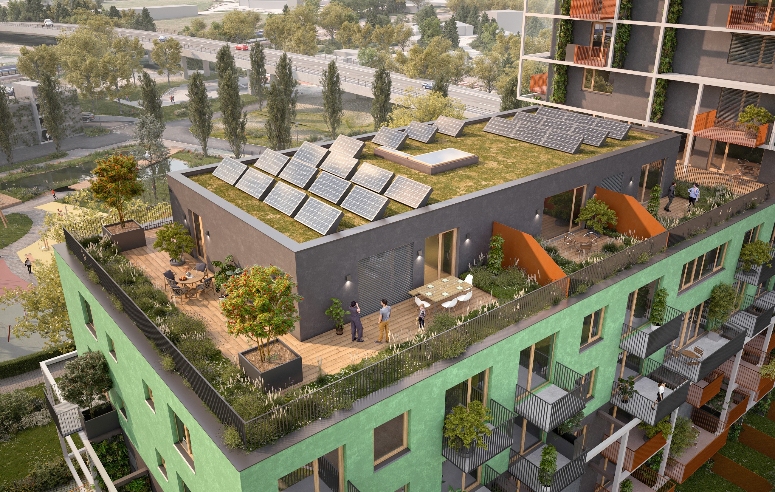 Etapa IV tvoří výškové dominanty celého projektu. Byty nabídnou panoramatické výhledy, velké balkóny a fasády s výraznou zelení a modulárními prvky.